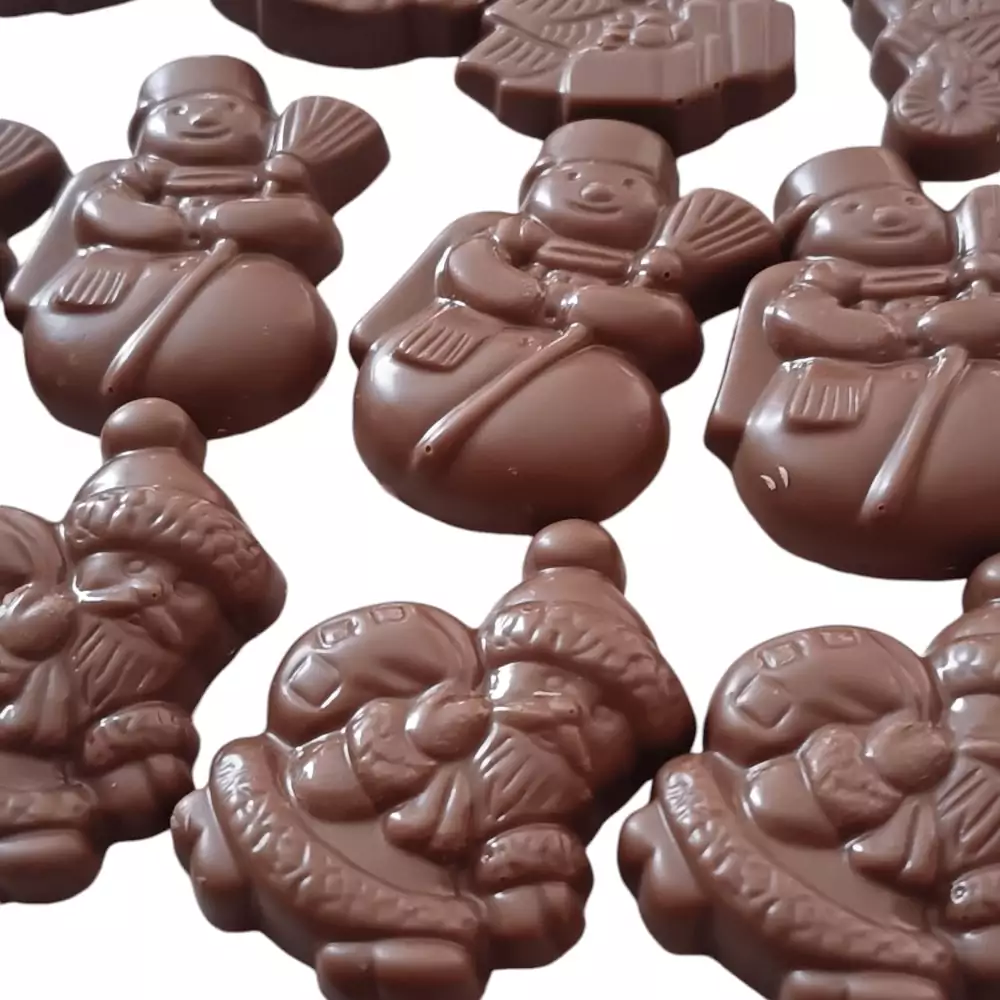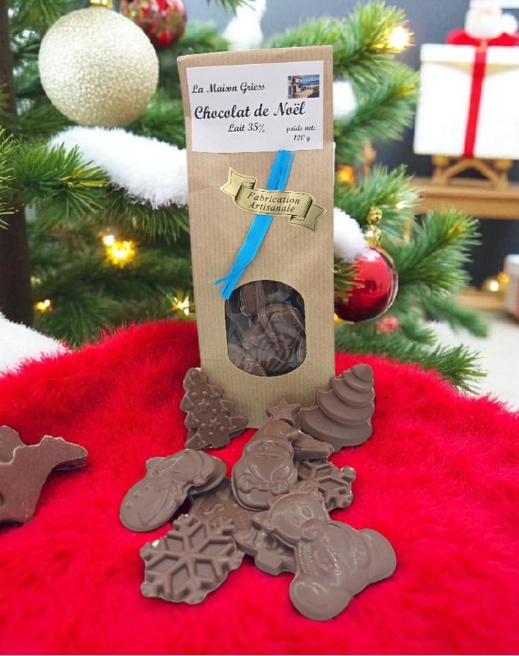 Chaque sachet contient un assortiment de petite figurine en forme de père noël, sapin, maison de pain d’épice, flocon et bonhomme de neige . Une fabrication artisanale de la friture de Noël pour les amateurs de chocolat, garanti pure beurre de cacao.