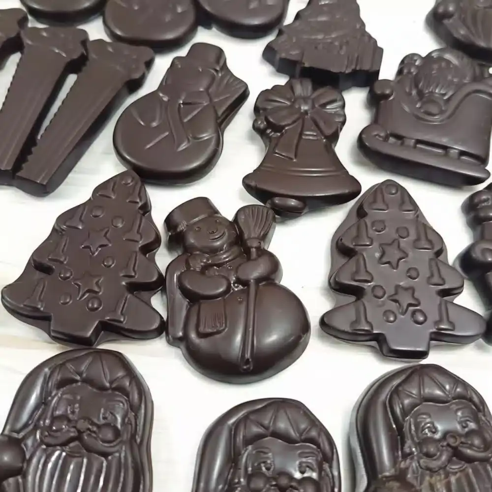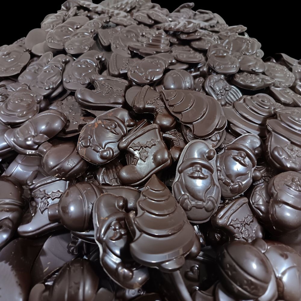 Chaque sachet contient un assortiment de petite figurine en forme de père noël, sapin, maison de pain d’épice, flocon, bonhomme de neige etc. . Une fabrication artisanale de la friture de Noël pour les amateurs de chocolat noir pur et intense, garanti pure beurre de cacao.