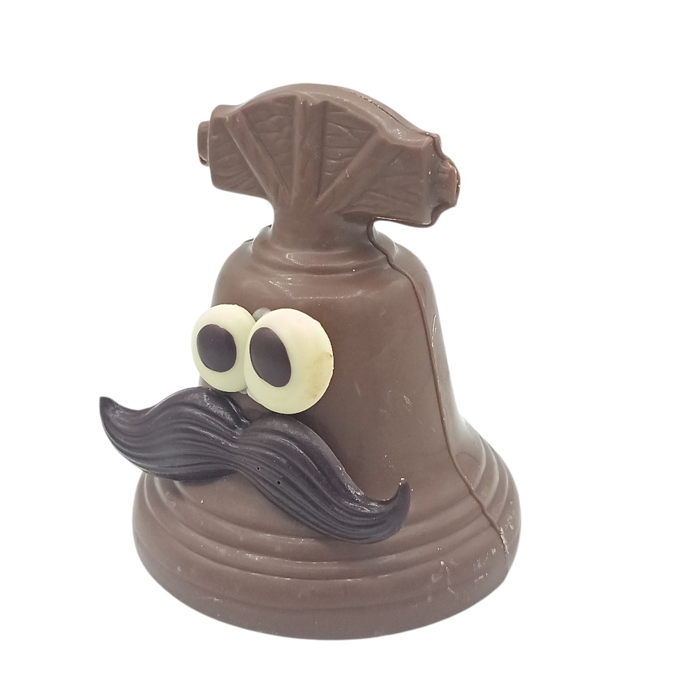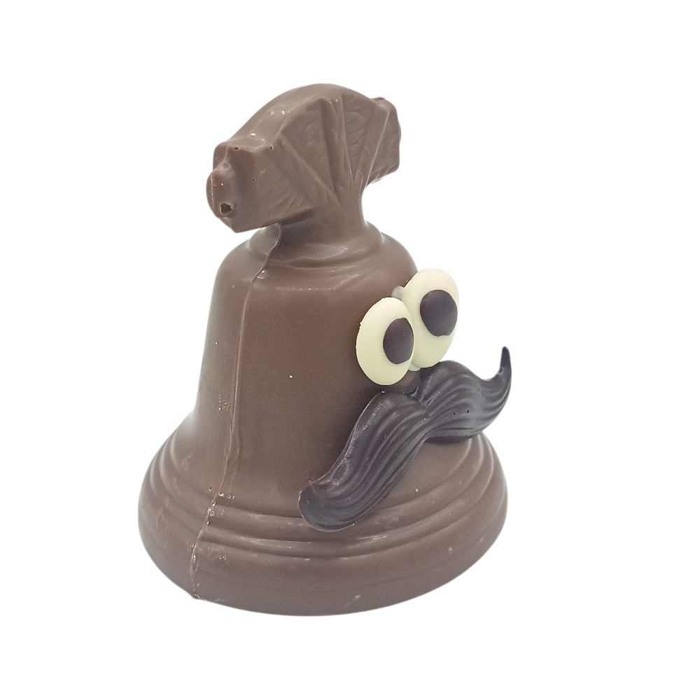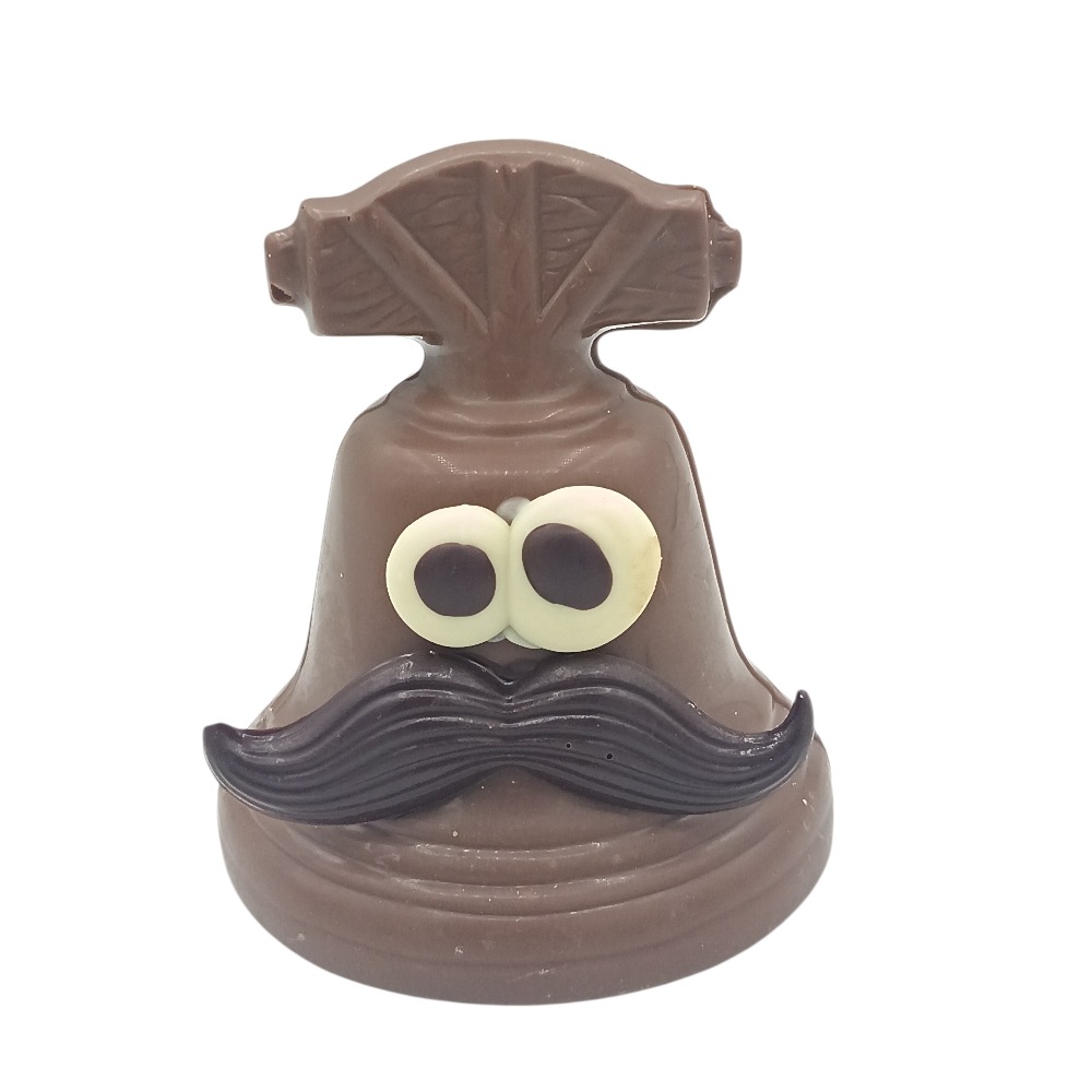 petite cloche de 8 cm en chocolat au lait 35% avec sa moustache en chocolat noir et son regard espiègle