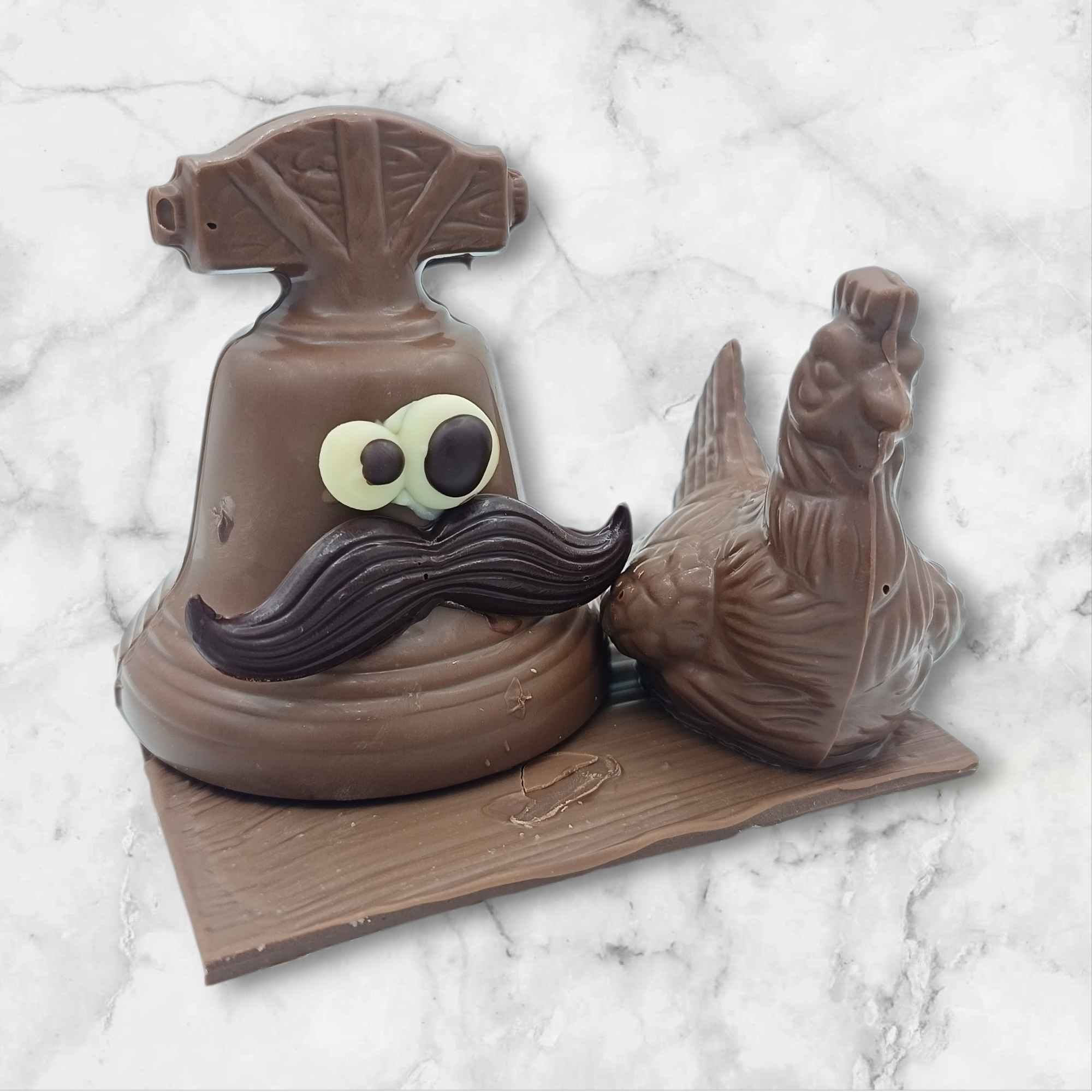 petite cloche de 8 cm en chocolat au lait 35% avec sa moustache en chocolat noir et son regard espiègle
