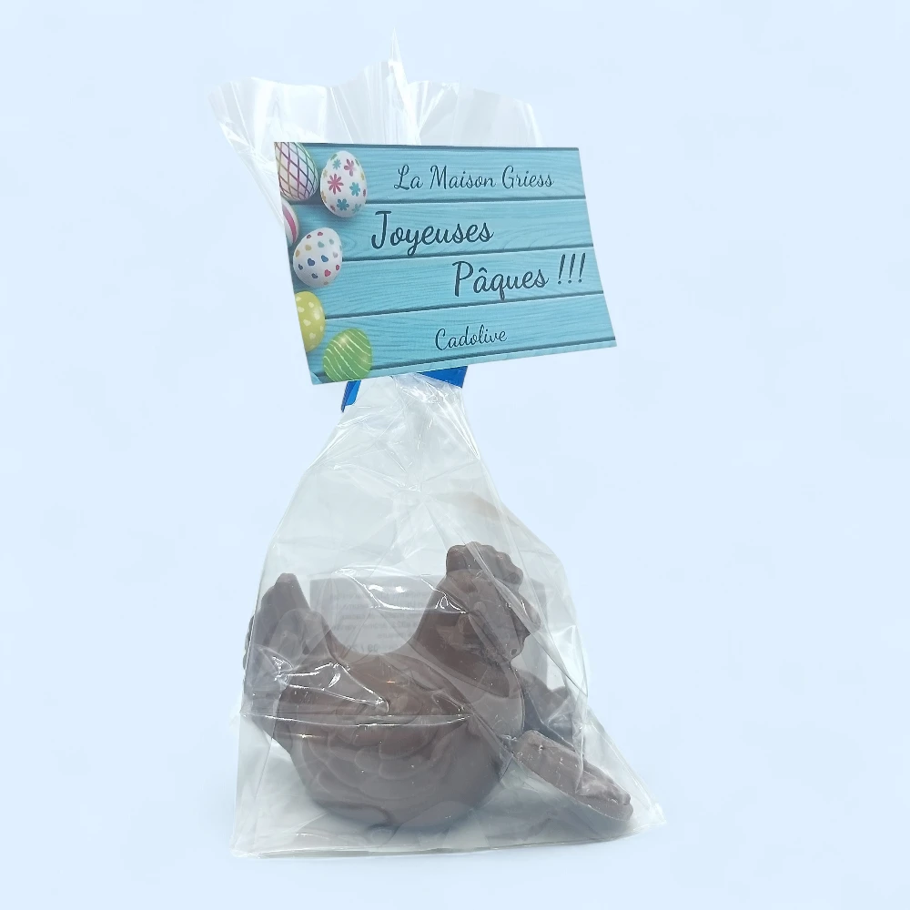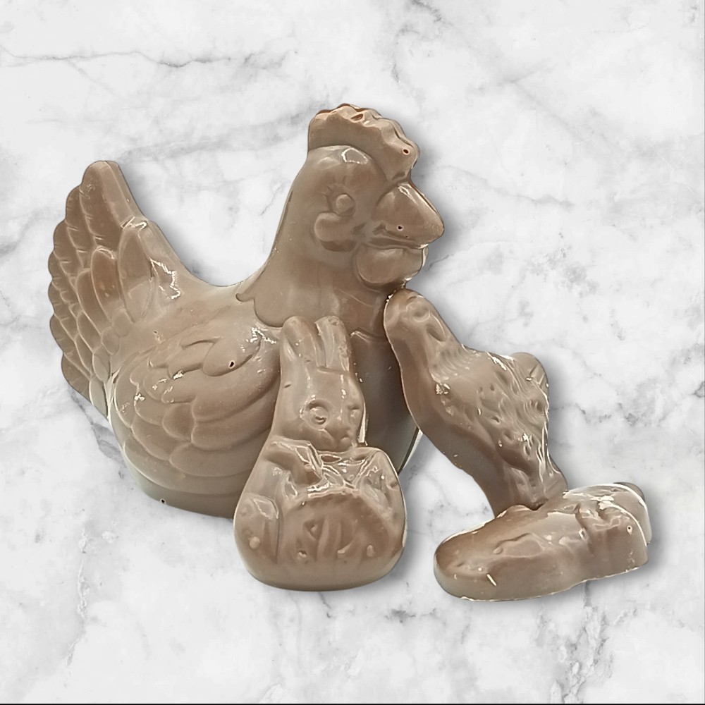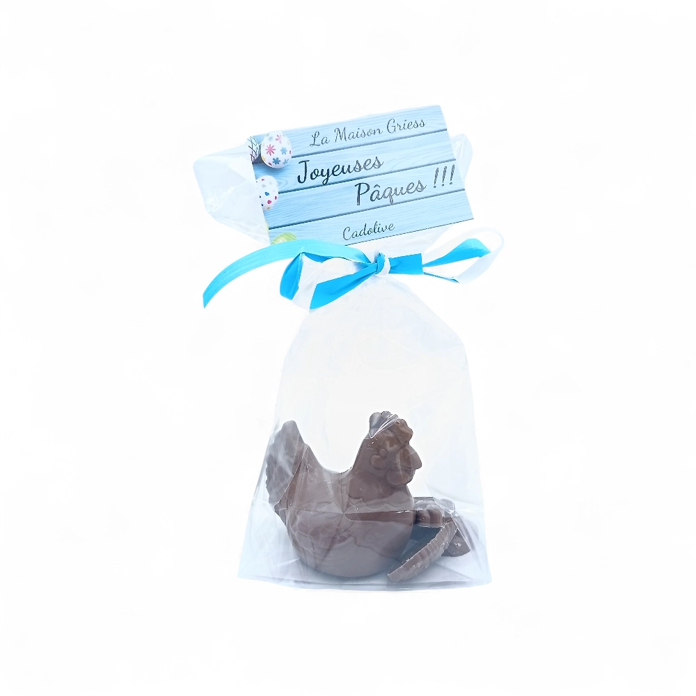 Poule en chocolat au lait supérieur  35% minimum de cacao  avec sa friture de Pâques